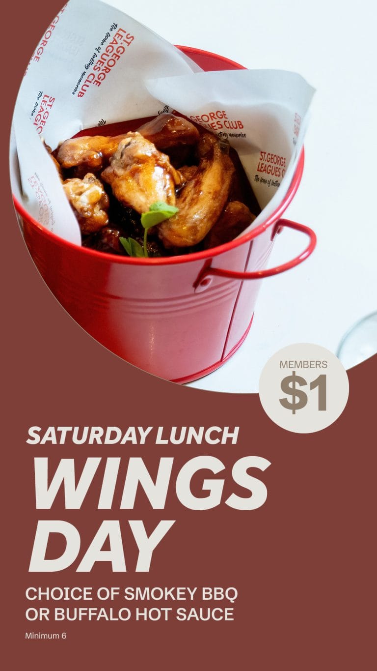 Conditions apply. Specials available from Thursday 11 September 2025 until removed. Specials available to current St. George Leagues Club members only. To learn more about membership, visit ST.GEORGE Rewards and join today from only $3. Lunch specials available at Jubilee Brasserie Monday to Wednesday between 11.30am – 2.30pm while stock lasts. Dinner specials available at Jubilee Brasserie only on the days specified between 5.30pm – 9pm, with the exception of Wings Friday which is available to 9.30pm while stock lasts. Dining specials not available on public holidays or NRL Dragons home games at Jubilee Stadium.