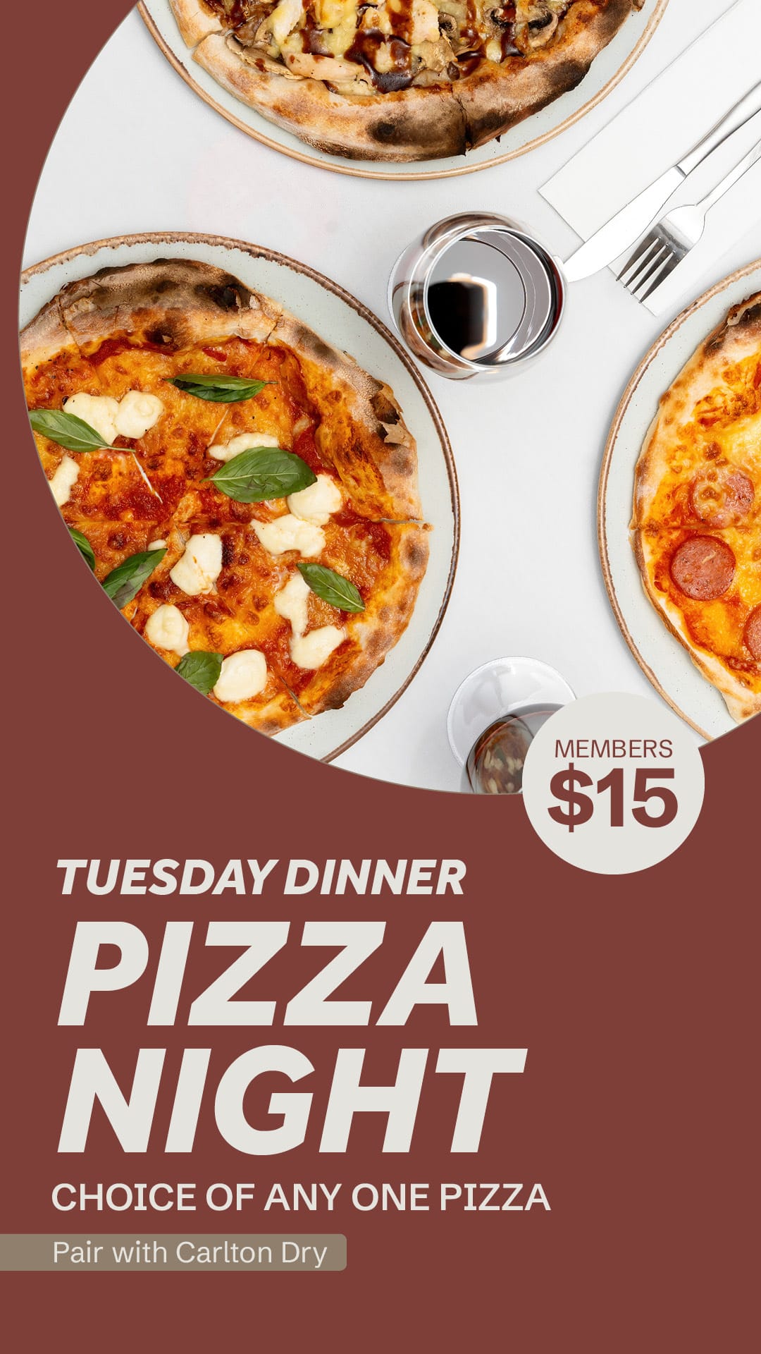 Exclusive Tuesday evening offer lets members enjoy any pizza for $15.