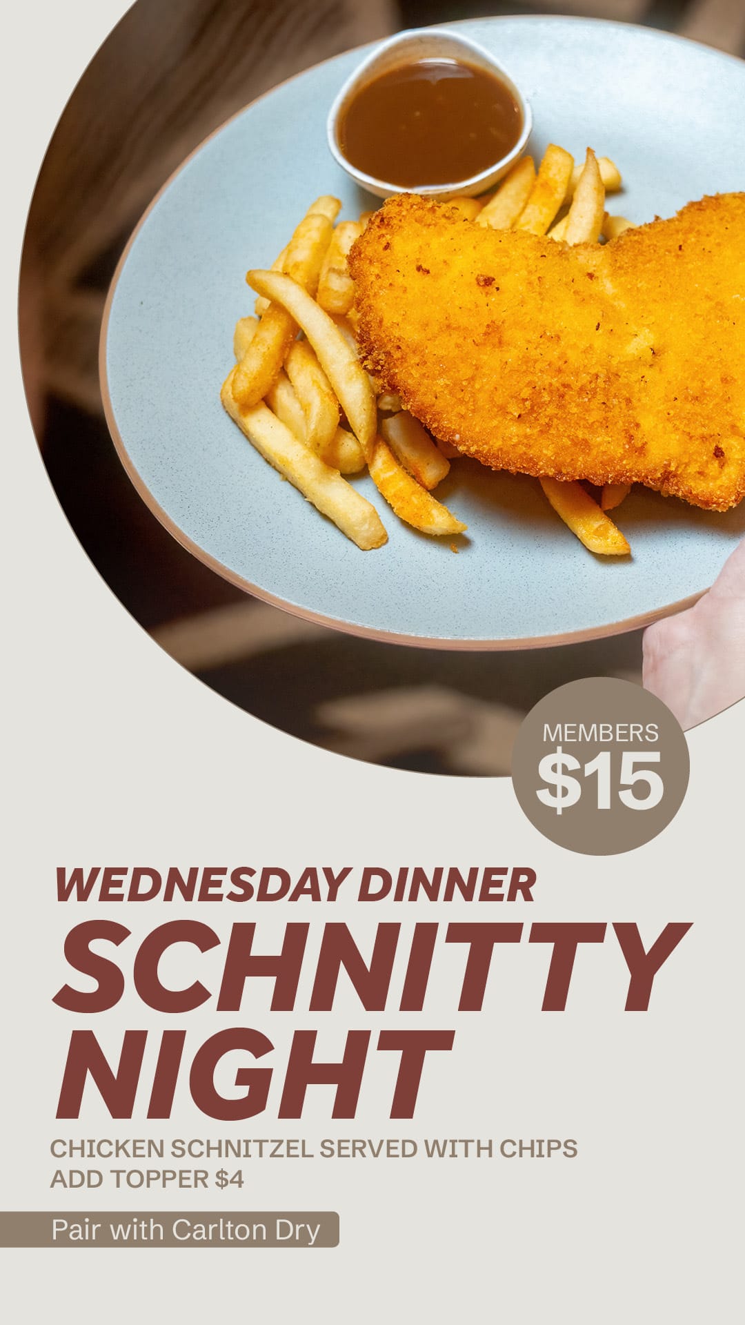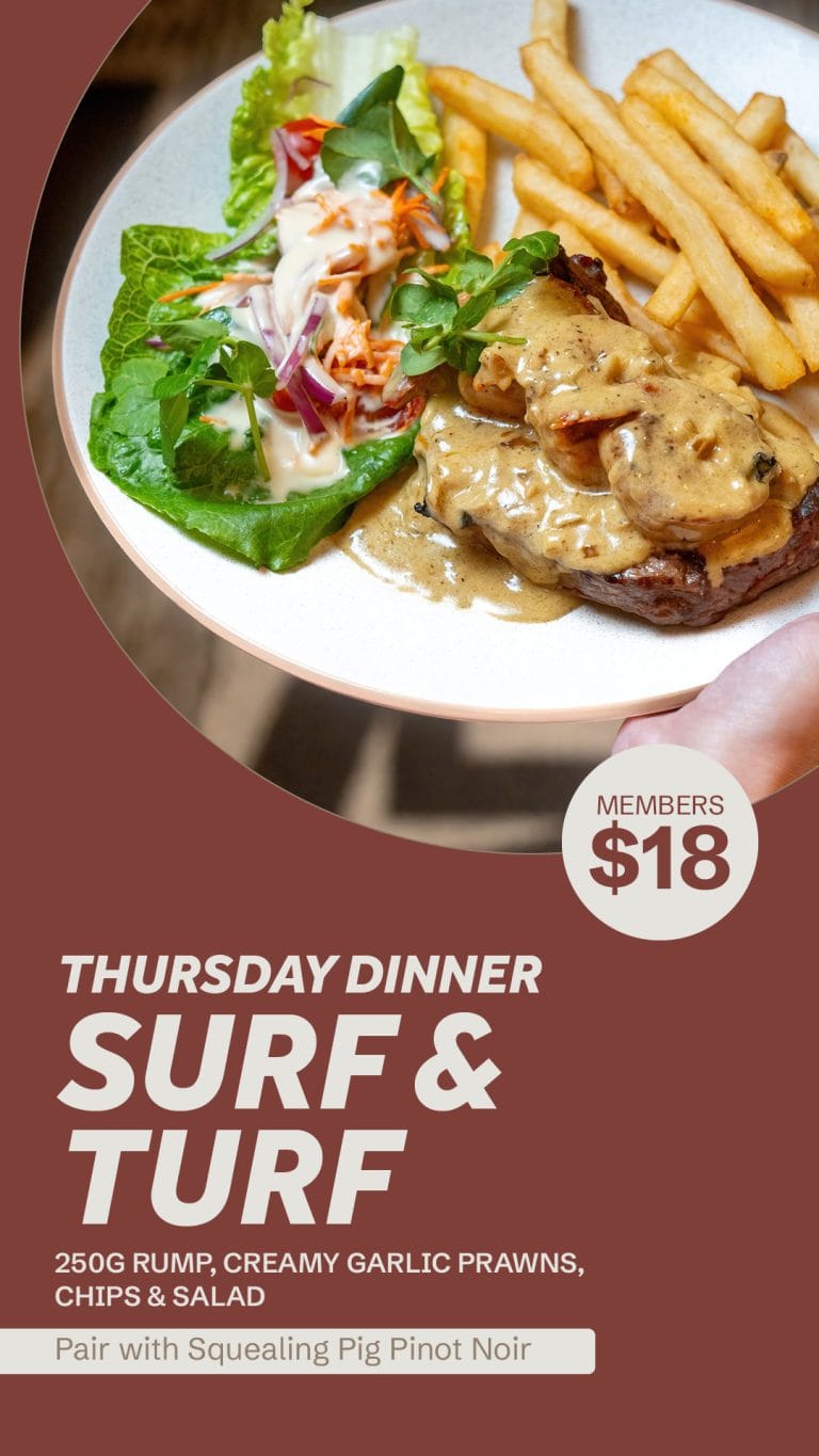 200gm rump steak served with chips and your choice of sauce, available Monday to Wednesday $15 for members.